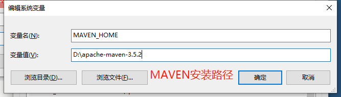 3、填写变量名MAVEN_HOME,变量值为MAVEN的安装路径,点击确定按钮
