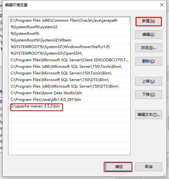 4、双击系统变量的PATH变量、点击新建按钮,变量值为MAVEN文件夹下bin文件夹的路径,点击确定按钮,然后其他界面都确定保存即可