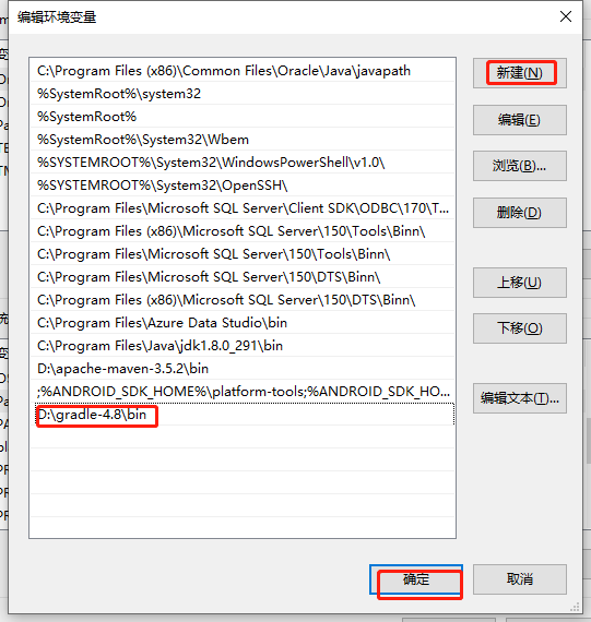 6、双击系统变量的PATH变量、点击新建按钮,变量值为GRADLE的bin文件夹路径,点击确定按钮,然后其他界面都确定保存