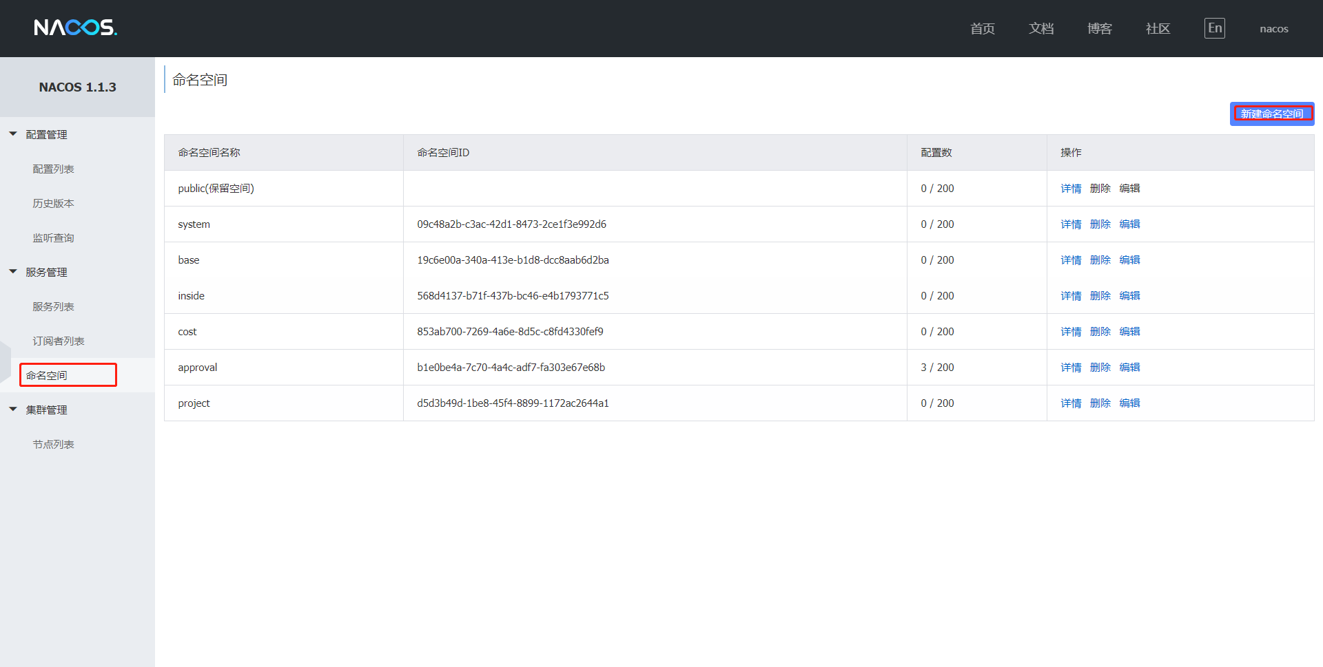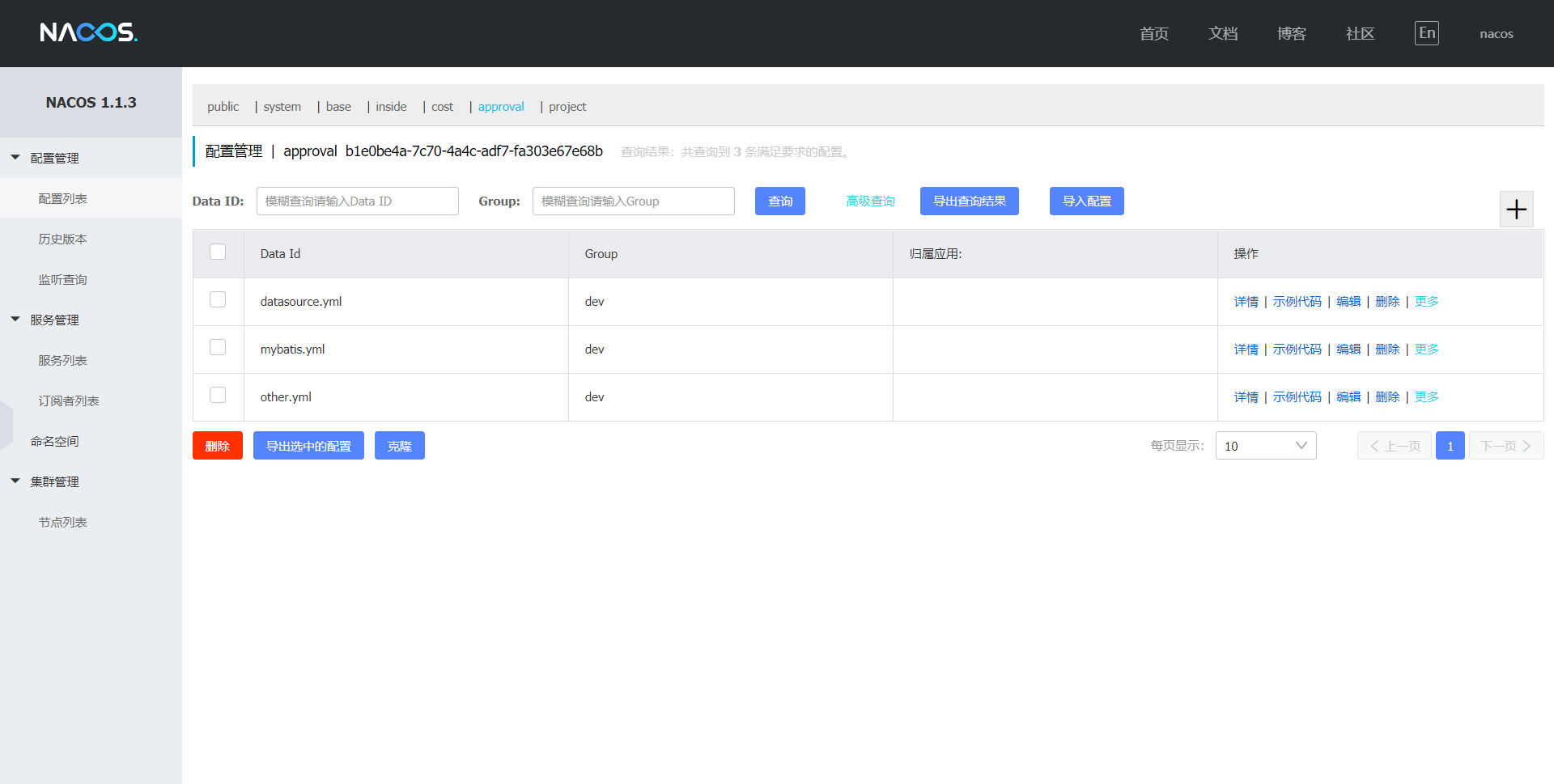 #命名空间,填命名空间id spring.cloud.nacos.config.namespace=b1e0be4a-7c70-4a4c-adf7-fa303e67e68b #有几个配置文件就配置几组 spring.cloud.nacos.config.ext-config[0].data-id=datasource.yml