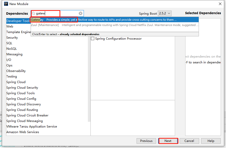 1、创建新的module使用spring向导,填写项目名称等信息后下一步,搜索gateway选中一直下一步即可。