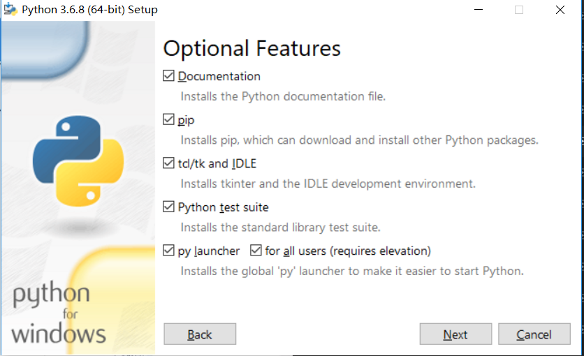 b.选择:1.自定义安装;2.选择所有用户;3.添加python3到环境变量。