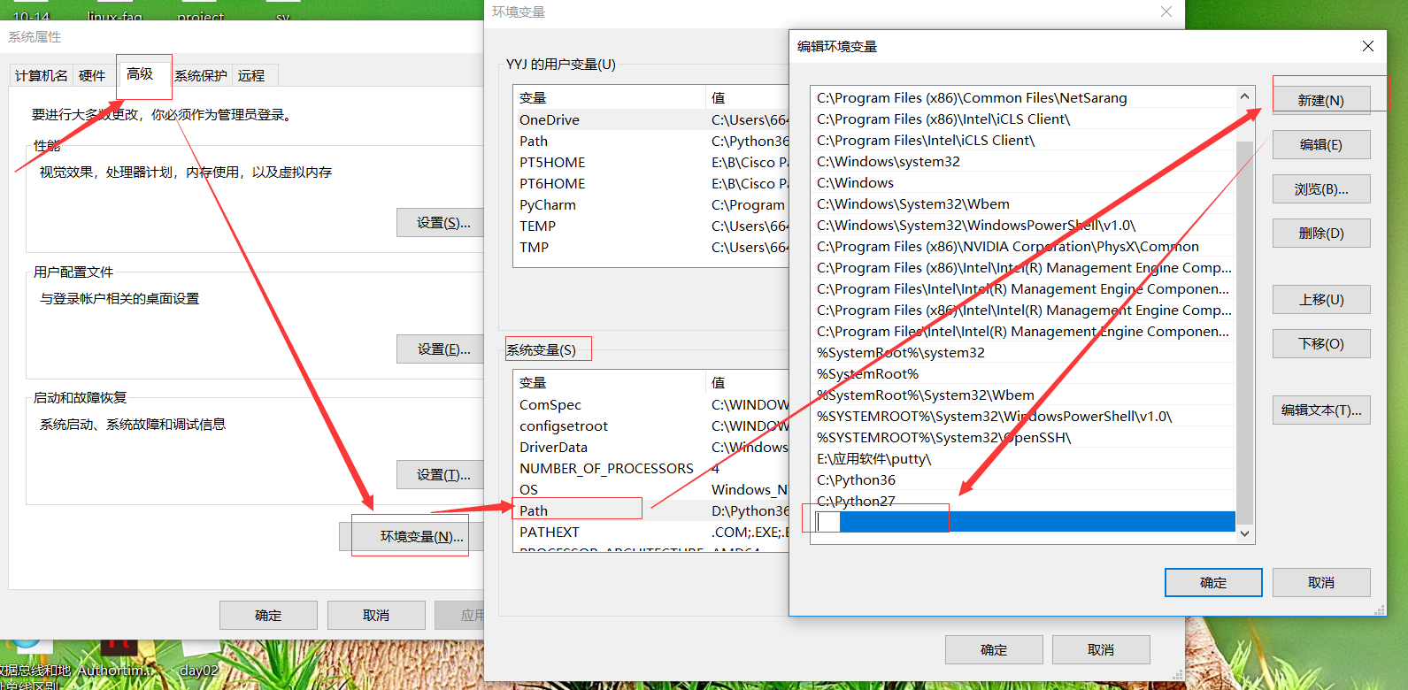 b.手动添加环境变量。例如:D:\Python36(此路径是python.exe文件的路径)