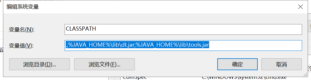 ③在系统变量里新建变量CLASSPATH;把jdk安装目录(JAVA_HOME)下的lib子目录中的dt.jar和tools.jar设置到CLASSPATH中