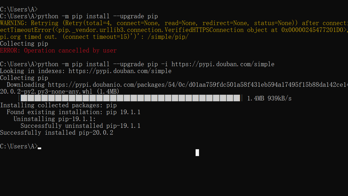 解决方法:python -m pip install --upgrade pip -i https://pypi.douban.com/simple