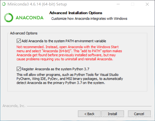 注意这两个都要勾选,一个是让我们可以直接在cmd使用conda指令,第二个是把miniconda自带的python3.7作为系统python。