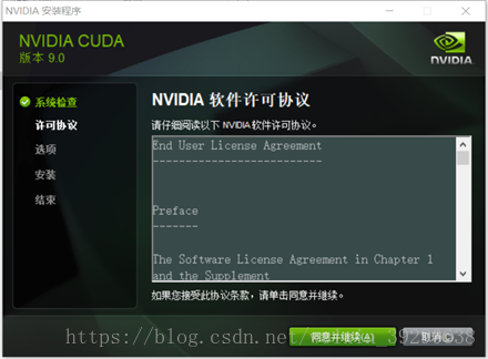 运行cuda_9.0.176_win10.exe。安装软件会先运行一个系统检查,如果没有软硬件不兼容的情况就能继续进行下一步。若有不兼容情况,系统检查则会报错,无法进行下一步。