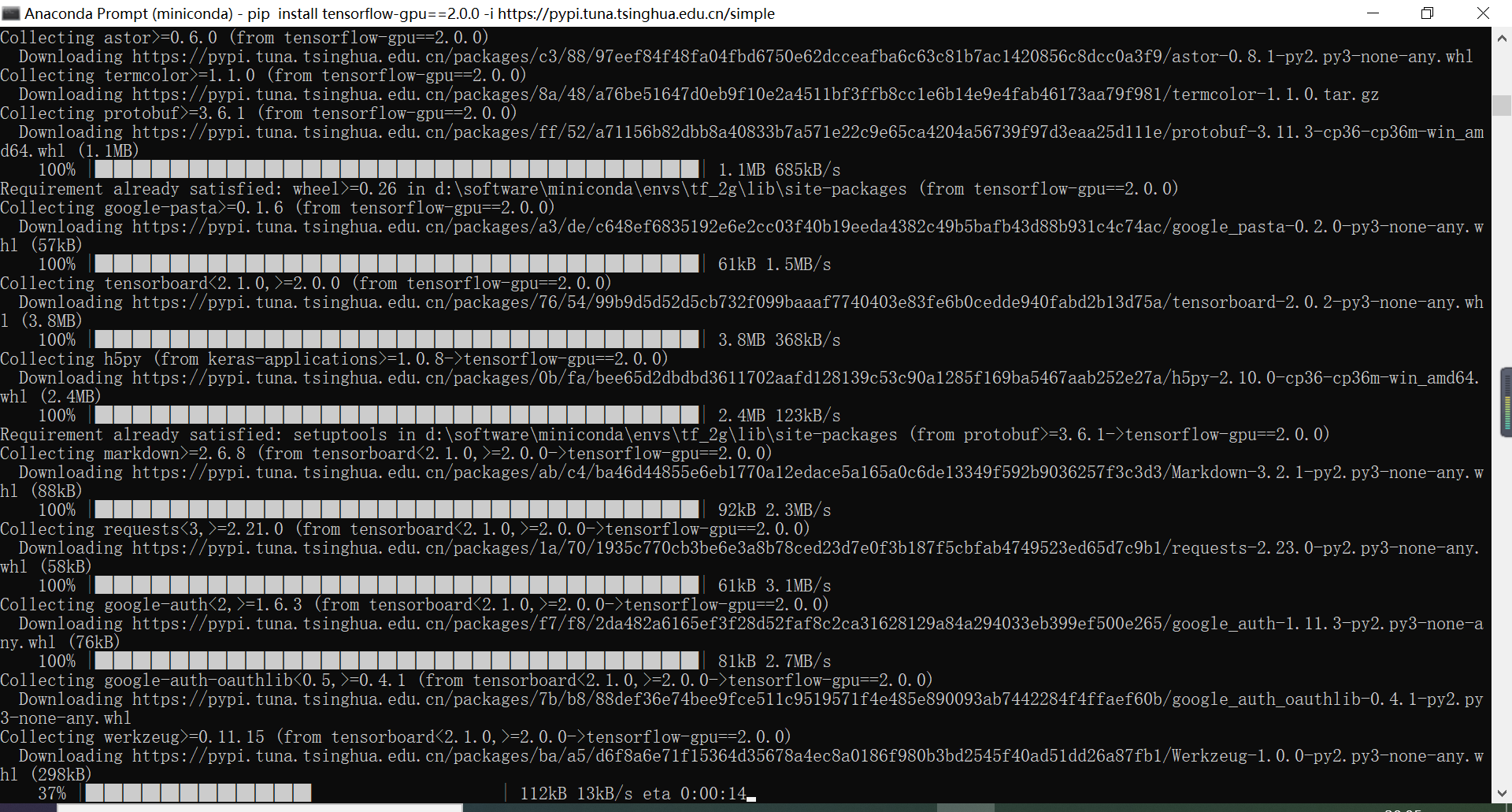 安装TF2.0 GPU版本(后面的 -i 表示从国内清华源下载,速度比默认源快很多)
