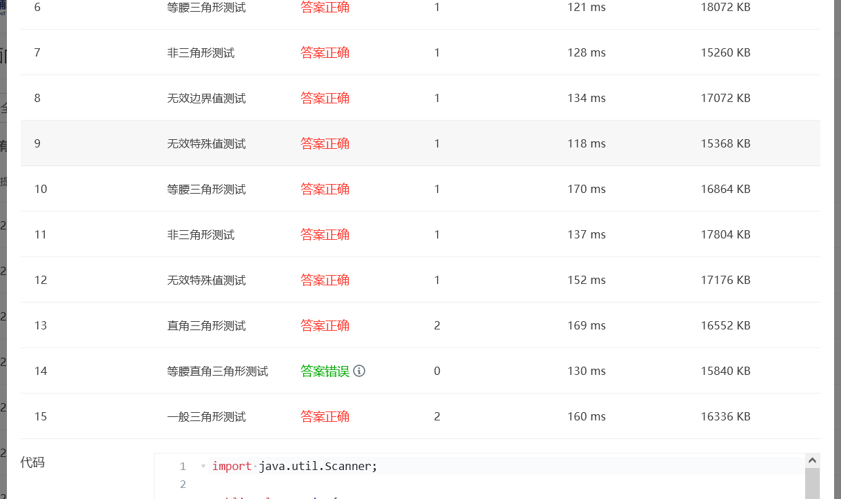 有部分测试点极易采坑,例如题目集1的7-8中判断是否为等腰直角三角形,一开始并没有意识到比例为1:1:√2,输入的数据必定是有限小数位,因此不可能使三边比为1:1:√2,导致这个测试点一直过不去,思考了很久才发现只需要将二者之差控制在一定范围内将其视为相等就行。