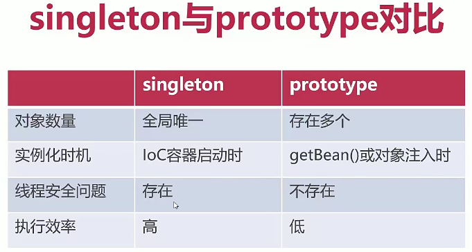 ◆ bean scope属性用于决定对象何时被创建与作用范围(scope属性:1.singleton单例默认值,每一个容器有且只有唯一的实例实例被全局共享 2.prototype多例每次使用时都是创建一个实例)