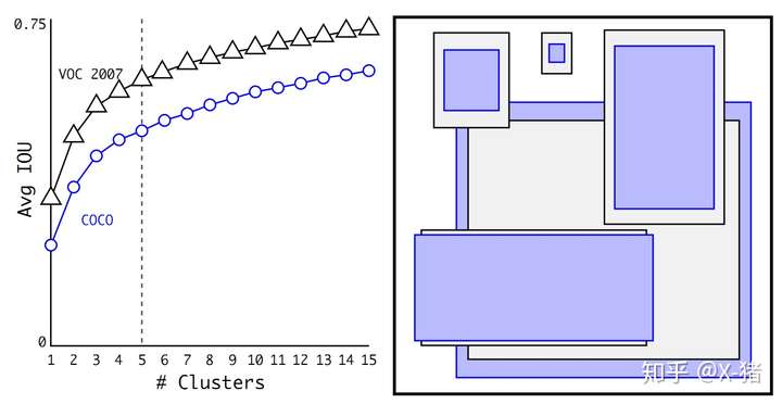 上图左边是选择不同的聚类k值情况下,得到的k个centroid边框,计算样本中标注的边框与各centroid的Avg IOU。显然,边框数k越多,Avg IOU越大。YOLO2选择k=5作为边框数量与IOU的折中。对比手工选择的先验框,使用5个聚类框即可达到61 Avg IOU,相当于9个手工设置的先验框60.9 Avg IOU。
