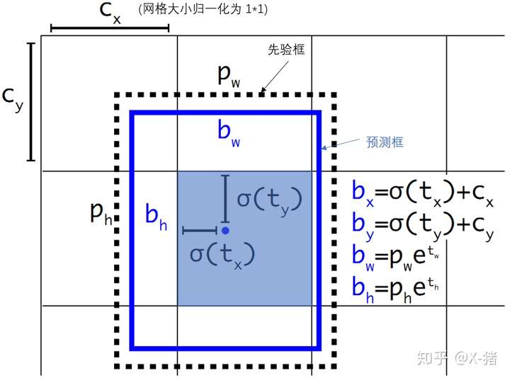 是当前网格左上角到图像左上角的距离,要先将网格大小归一化,即令一个网格的宽=1,高=1。