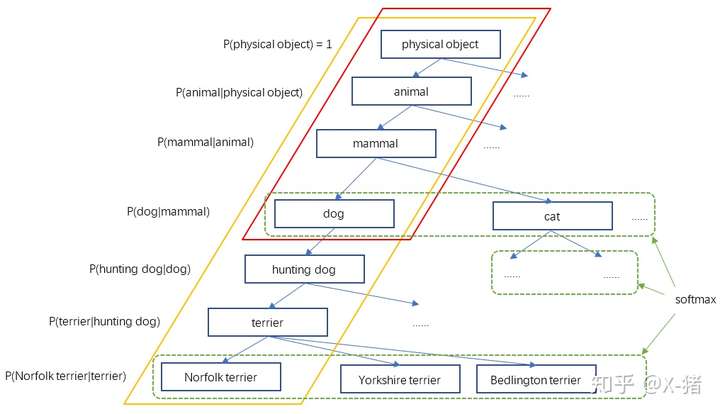 比如一个样本图像,其标签是是"dog",那么显然dog节点的概率应该是1,然后,dog属于mammal,自然mammal的概率也是1,......一直沿路径向上到根节点physical object,所有经过的节点其概率都是1。参考上面图10,红色框内的节点概率都是1,其它节点概率为0。另一个样本假如标签是"Norfolk terrier",则从"Norfolk terrier"直到根节点的所有节点概率为1(图10中黄色框内的节点),其它节点概率为0。