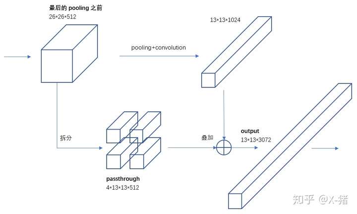 YOLO2引入一种称为passthrough层的方法在特征图中保留一些细节信息。具体来说,就是在最后一个pooling之前,特征图的大小是26*26*512,将其1拆4,直接传递(passthrough)到pooling后(并且又经过一组卷积)的特征图,两者叠加到一起作为输出的特征图。