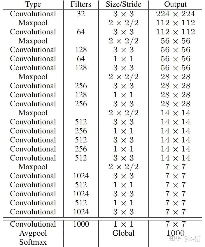 为了进一步提升速度,YOLO2提出了Darknet-19(有19个卷积层和5个MaxPooling层)网络结构。DarkNet-19比VGG-16小一些,精度不弱于VGG-16,但浮点运算量减少到约1/5,以保证更快的运算速度。