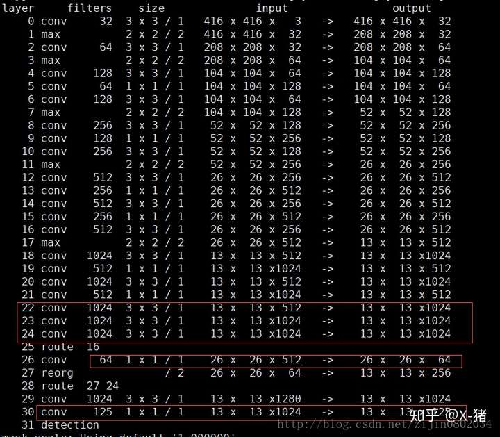 看一下passthrough层。图中第25层route 16,意思是来自16层的output,即26*26*512,这是passthrough层的来源(细粒度特征)。第26层1*1卷积降低通道数,从512降低到64(这一点论文在讨论passthrough的时候没有提到),输出26*26*64。第27层进行拆分(passthrough层)操作,1拆4分成13*13*256。第28层叠加27层和24层的输出,得到13*13*1280。后面再经过3*3卷积和1*1卷积,最后输出13*13*125。
