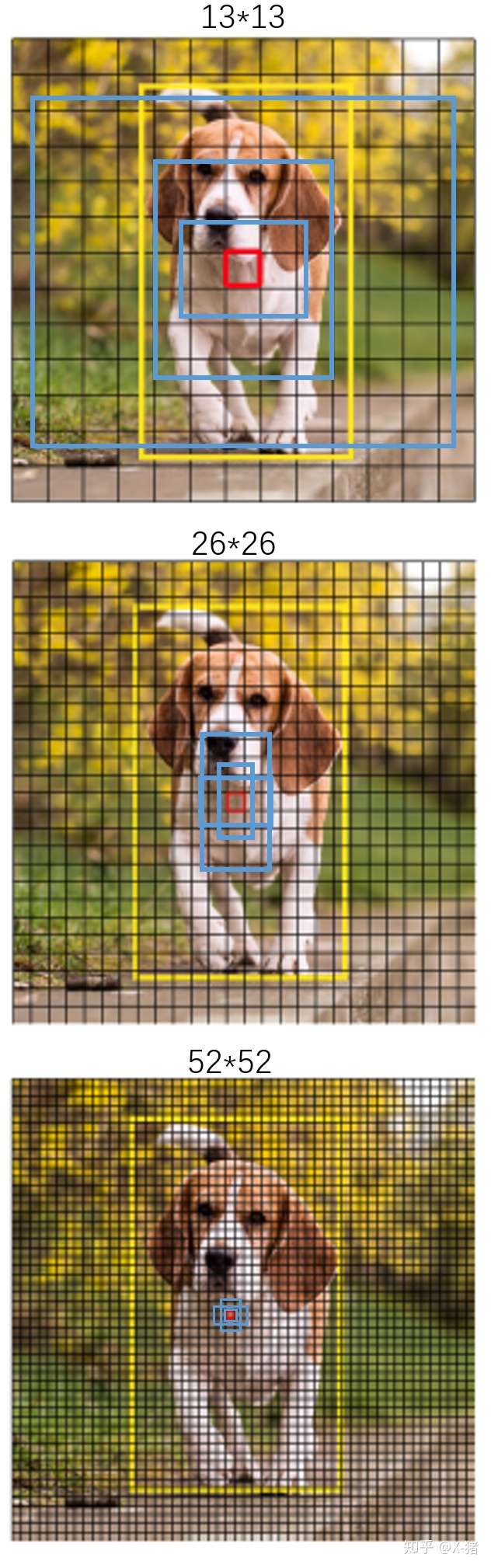 感受一下9种先验框的尺寸,下图中蓝色框为聚类得到的先验框。黄色框式ground truth,红框是对象中心点所在的网格。
