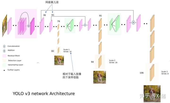 最后,第91层特征图再次上采样,并与第36层特征图融合(Concatenation),最后得到相对输入图像8倍下采样的特征图。它的感受野最小,适合检测小尺寸的对象。