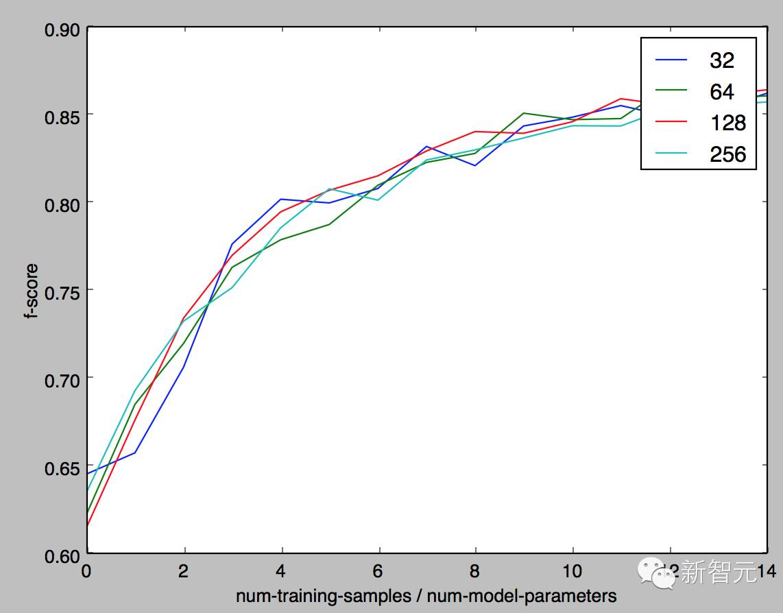 图(1)中,x轴表示训练样本数量与模型参数数量的比值。y轴是模型的f-score值。图中不同颜色的曲线对应于带有不同参数数量的训练模型。例如,红色曲线表示一个具有128个参数的模型随着训练样本数量128 X 1,128 X 2 等等这样变化时,f-score值的变化情况。