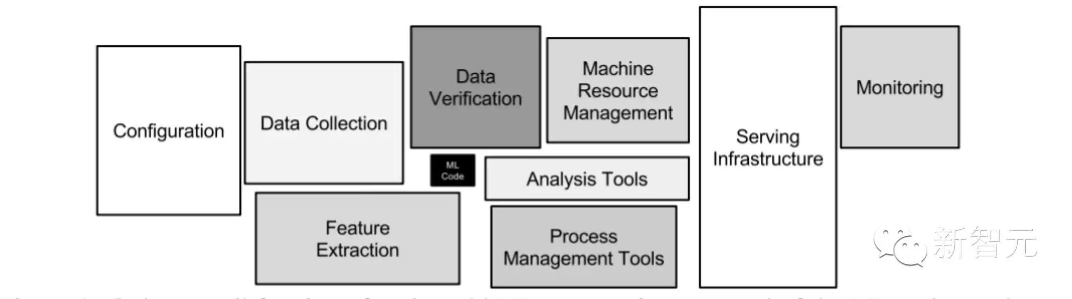 图1:在真实世界的整个机器学习系统中,只有一小部分是由机器学习的代码组成,图片中用中间的小黑盒来表示。它需要大量并且复杂的周边设施。