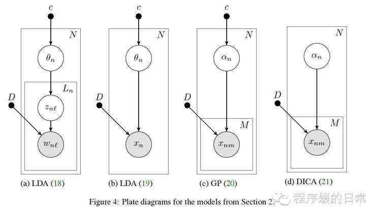 这篇文章有很多结论和中间结论,对于 topic modeling/probablistic modeling 感兴趣的同学很推荐看一下。我们以前熟悉的 LDA,其实没有把 document length 作为 random variable model 进去,这就导致 LDA 并不是一个完整的 probablistic model。如果把这个 document length 作为 random variable(negative binomial)model 进去的话,就会发现 LDA 可以等价为一种 Gamma-Poisson model(GP model),而如果我们再把 topic intensities alpha 再加一些独立约束,这个 GP model 就变成了我们更熟悉的 discrete independent component analysis(DICA)model。以上就是这个工作的第一步,建立 LDA 和 DICA 的联系。