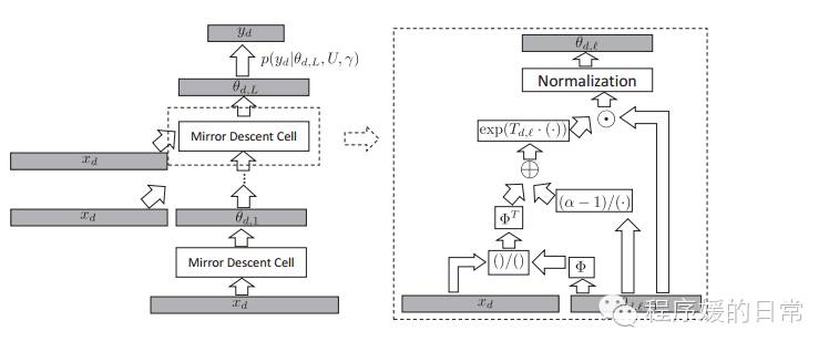 使用 MAP 方法和 Bayesian rule + constraints,他们把 supervised LDA 优化转变成了一个可以用 Mirror Decent Back Propagation 的问题。这样转换后,整个优化过程(\theta 和 y 的 inference)就可以看做一个 deep 的架构,而 Mirror Descent Algorithm 层就可以看做 deep networks 中的 feature extractor。