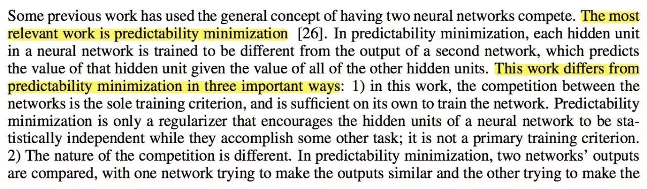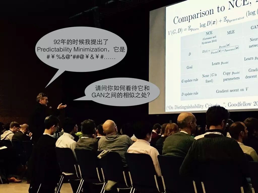 只见他站起来之后,先讲自己在 1992 年提出了一个叫做 Predictability Minimization 的模型,说它如何如何,一个网络干嘛另一个网络干嘛,花了好几分钟,接着话锋一转,直问台上的 Goodfellow:“你觉得我这个 PM 模型跟你的 GAN 有没有什么相似之处啊?”