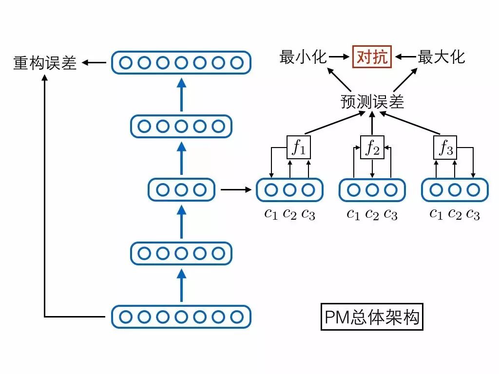 当然,除了上述两个相互对抗可预测性 loss,别忘了还有个自编码器本身的重构误差 loss,它能够保证编码中尽可能保留了原始输入样本的重要信息。论文中其实还有其他 loss,但不是重点,感兴趣的人可以去读原论文。将上述网络模块与 loss 函数全部集中在一起,就形成了 PM 模型的总体架构图,我们用这张图作为第二部分的总结: