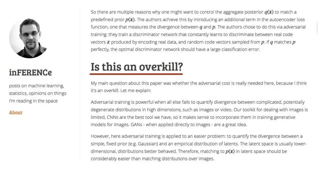inference.vc(http://www.inference.vc/)是一个关于生成模型的著名博客,其中有篇文章认为对抗自编码器中用 GAN 来拉近编码分布和高斯分布,是杀鸡用牛刀的做法。