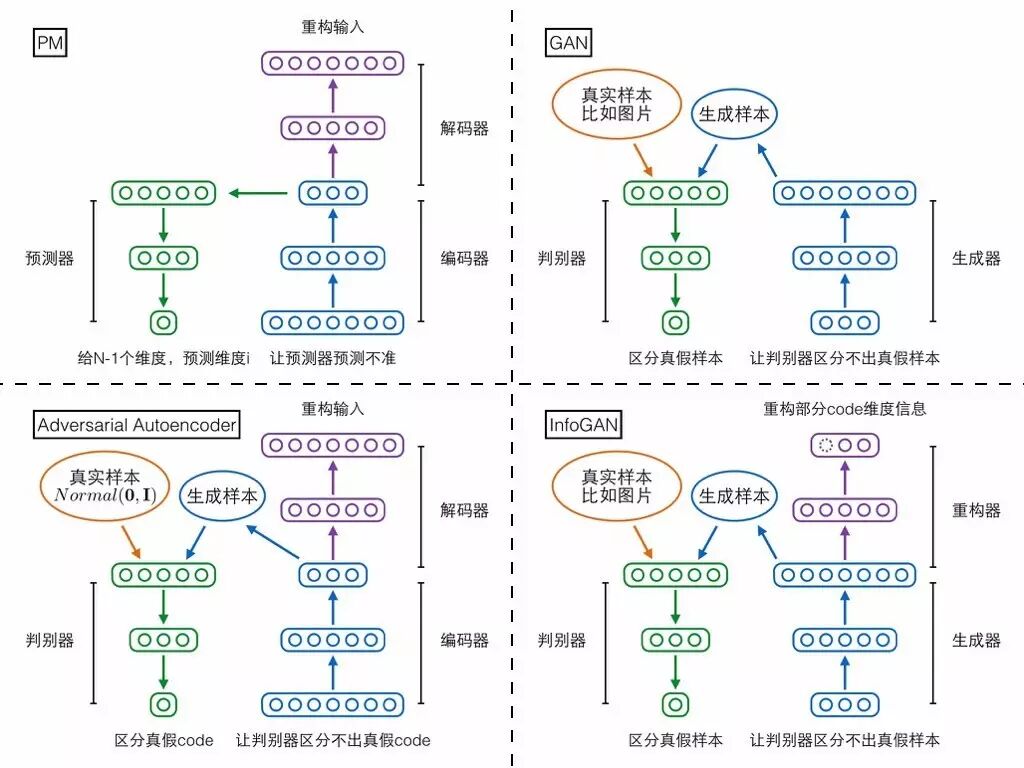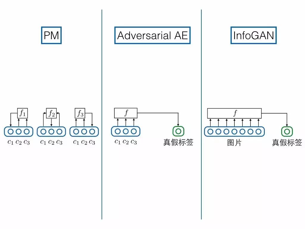 PM 输入编码其他维度,预测某一维度;对抗自编码器,输入编码全部维度,预测真假标签;InfoGAN 和前面 GAN 的情况相同,输入图片,预测真假标签。在这个角度上对抗自编码器与 PM 更相似。