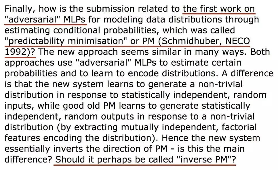 那为什么在最终版本里又出现了 PM 的内容呢?原来,当年 Schmidhuber 就是 NIPS 的审稿人,而且刚好就审到了 Goodfellow 的论文。我们现在知道这篇论文挖了一个巨大无比的坑,引得大批人马前赴后继都来做 GAN 的研究,以后也应该是能写进教科书的经典工作。但就是这样牛逼的一篇论文,当年 Schmidhuber 居然给出了拒稿意见!所幸另外两位审稿人识货,所以论文最后还是被收了。