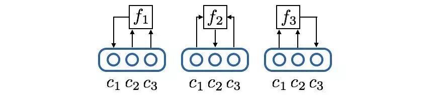 接着,使用三个预测器网络 f1, f2, f3 把上述逻辑具体化,其中预测器 1 负责预测维度 1,输入维度 2 和 3,以此类推,数学形式如下: