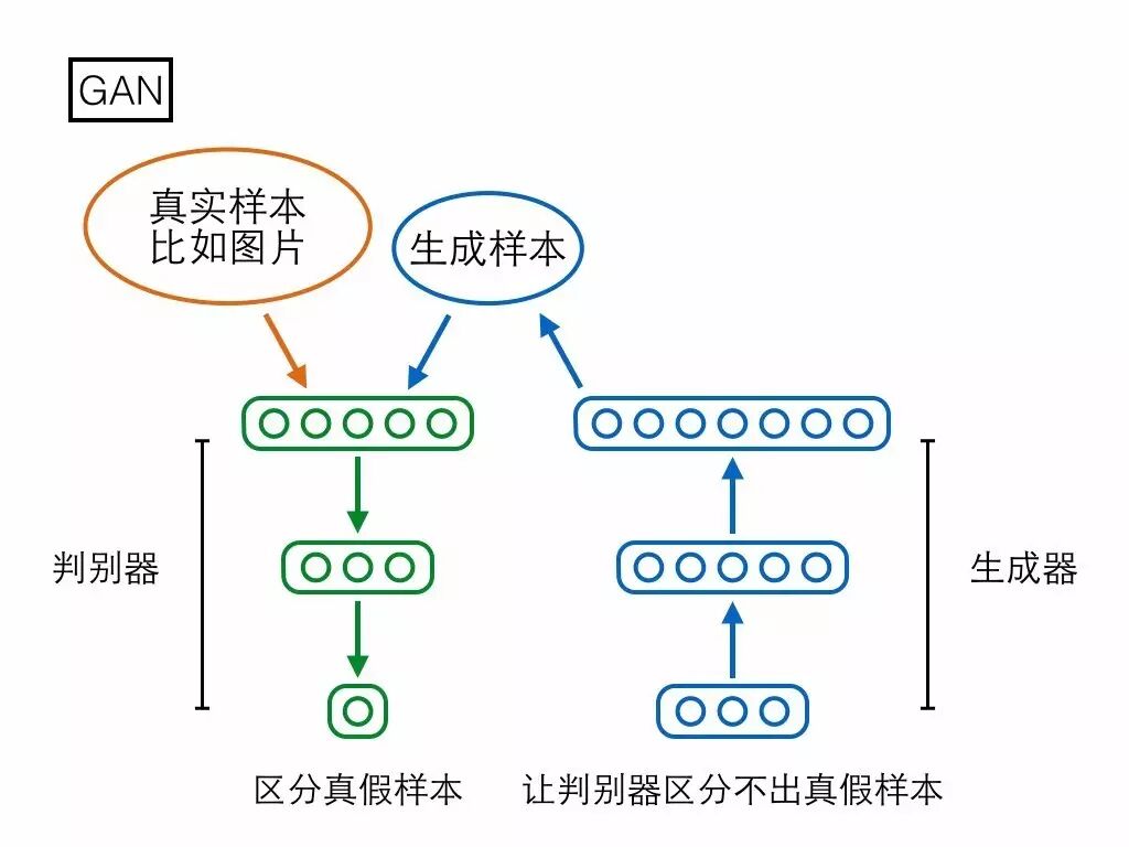 GAN 的判别器要区分真假样本,生成器要让它区分不准