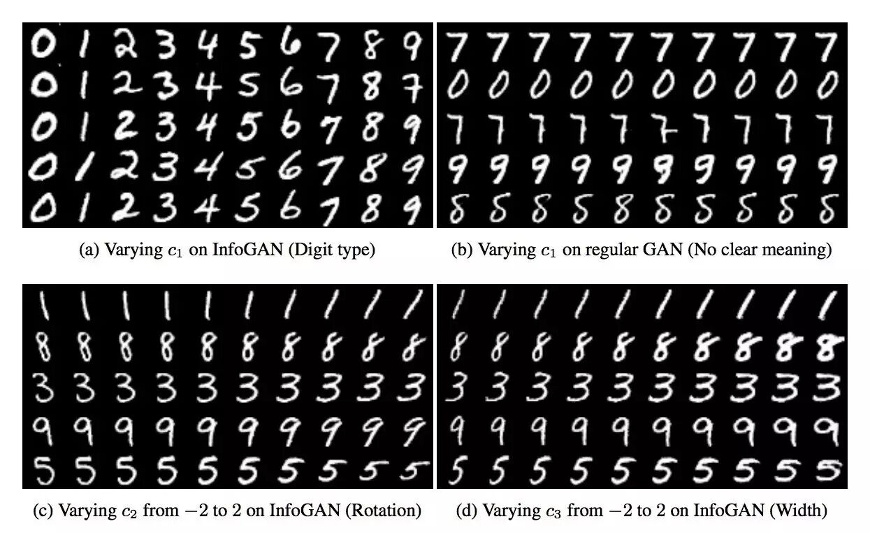 加上重构器模块之后,如果生成器拿这一部分维度当成无关痛痒的随机扰动来用,那重构器的任务就会比较艰难;但如果生成器拿这一部分维度当成样本的重要信息(或者套用 PCA 的术语,主成分)来用,那么输出样本就会和这部分编码维度高度相关,此时重构器能够比较轻松地从样本重构出原来的这部分编码。两相对比,生成器就会倾向于使用我们指定的这一部分维度来作为样本的重要信息(主成分)。训练结束后,甚至有机会观察到有些维度具有非常显著的语义信息,比如 InfoGAN 论文在 MNIST 手写数字上训练之后,可以观察到某个维度完全控制着 0-9 的数字类别,某个维度完全控制着数字图像从左到右的倾斜程度,这些显然就是 MNIST 数据集的重要信息(主成分):