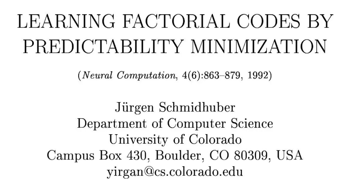 Schmidhuber 在 92 年提出的 PM 模型通过可预测性最小化来学习一个解耦的编码表示,编码器和预测器优化相反的目标,确实是比 GAN 更早地使用了对抗训练的思想。