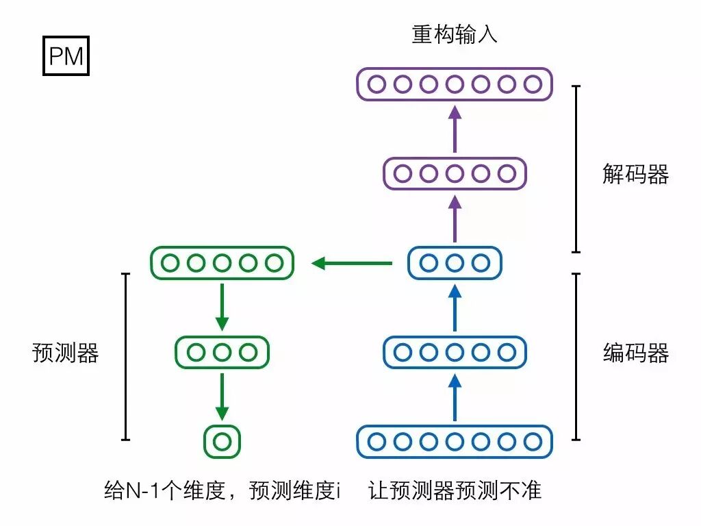 PM 的预测器要猜准某一维编码,编码器要让它猜不准