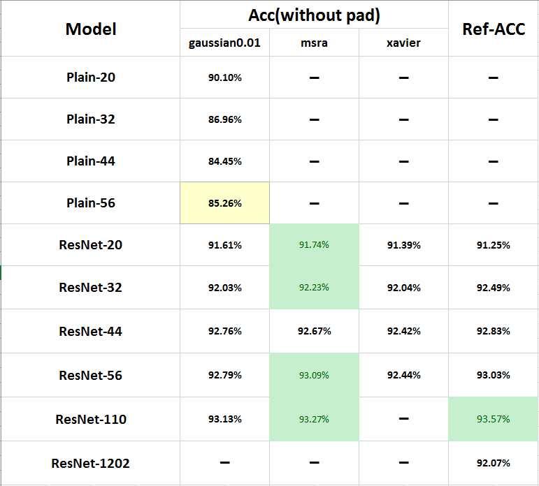 A代表zero-padding,B代表projection,可以看出,Option A得到的结果和论文中基本一致,因为论文中采用的就是这种方法,而Option B却是所有结果中最好的,可以看出projection的方法是要优于zero_padding的方法的!