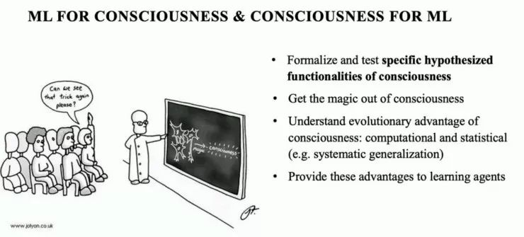 图 8:将机器学习用于意识&将意识用于机器学习——(1)形式化定义并测试特定的意识的假设函数(2)揭开意识的神秘面纱(3)从计算和统计的角度(例如,系统的泛化)理解意识演化的优势(4)将这些优势应用于学习智能体。