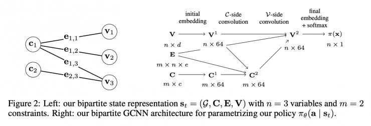 图 4:(左图)二分图 St=(G,C,E,V)有 n=3 个变量和 m=2 个常量。(右图)用于将策略πθ(a|st)参数化的二分图 GCNN 架构。