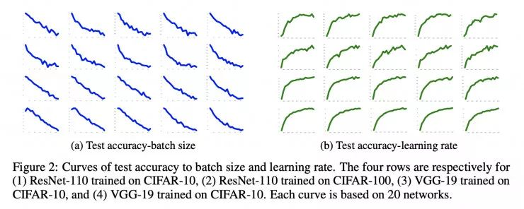 图 2:测试准确率与批处理大小、学习率的诶关系。第四行分别是(1)使用 CIFAR-10 数据集训练的 ResNet-110 模型(2)使用 CIFAR-100 数据集训练的 ResNet-110 模型(3)使用 CIFAR-10 数据集训练的 VGG-19 模型(4)使用 CIFAR-100 数据集训练的 VGG-19 模型。每条曲线都是根据 20 个网络的情况综合绘制而出。