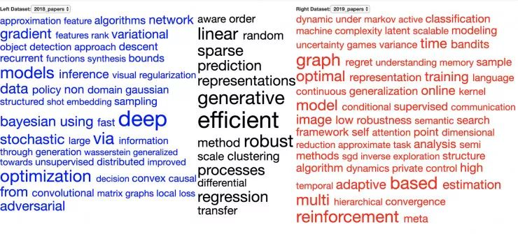 让我们从更宏观的角度看看本届 NeurIPS 大会上的论文都与什么主题相关。首先,我使用 Vennclods 将 1,011 份 NeurIPS 2018 的论文和 1,428 份 NeurIPS 2019 的论文的标题进行了可视化。中间黑色的部分是在这两年都十分常见的论文关键词的列表。