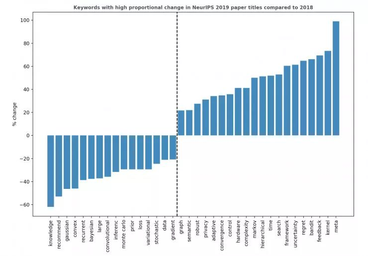 接着,如下图所示,我计算出了这些关键词从 2018 年到 2019 年的百分比变化。例如,如果在2018年,所有被接收的论文中有 1% 包含关键词「X」,而在2019年,这个数字是 2% ,那么这一比例的变化是(2-1) / 1=100% 。在下图中,我将绝对比例变化在 20% 以上的关键词绘制了出来。