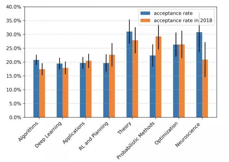 根据 NeurIPS 2019 程序委员会主席 Hugo Larochelle 的分析,接收率最高的论文类别是神经科学。在Yoshua Bengio的演讲「From System 1 Deep Learning to System 2 Deep Learning」和 Blaise Aguera y Arcas的演讲「Social Intelligence」中,他们都敦促机器学习研究社区更多地思考自然智能的生物学根源。