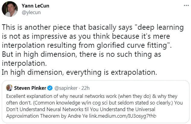 在该推文中,LeCun 表示:「深度学习并不像你想象的那么令人印象深刻,因为它仅仅是通过曲线拟合产生的插值结果。但在高维空间中,不存在插值这样的情况。在高维空间中,一切都是外推。」