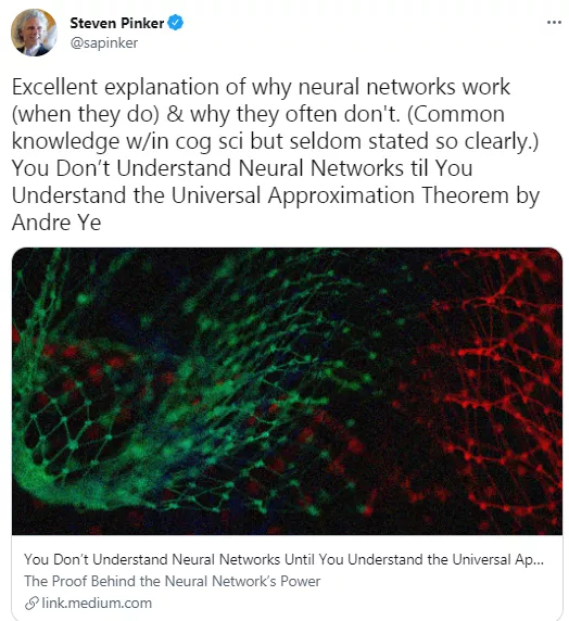 而 LeCun 转发的内容来自哈佛认知科学家 Steven Pinker 的一条推文,Pinker 表示:「 通用近似定理很好地解释了为什么神经网络能工作以及为什么它们经常不起作用。只有理解了 Andre Ye 的通用近似定理,你才能理解神经网络。」