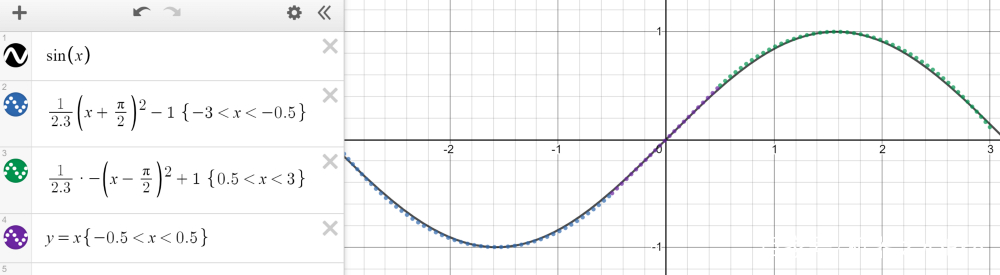 紧凑(有限、封闭)集合上的任何连续函数都可以用分段函数逼近。以 - 3 和 3 之间的正弦波为例,它可以用三个函数来近似——两个二次函数和一个线性函数,如下图所示。