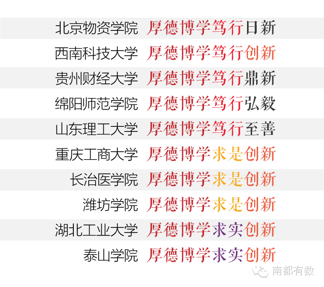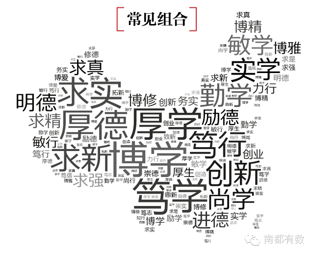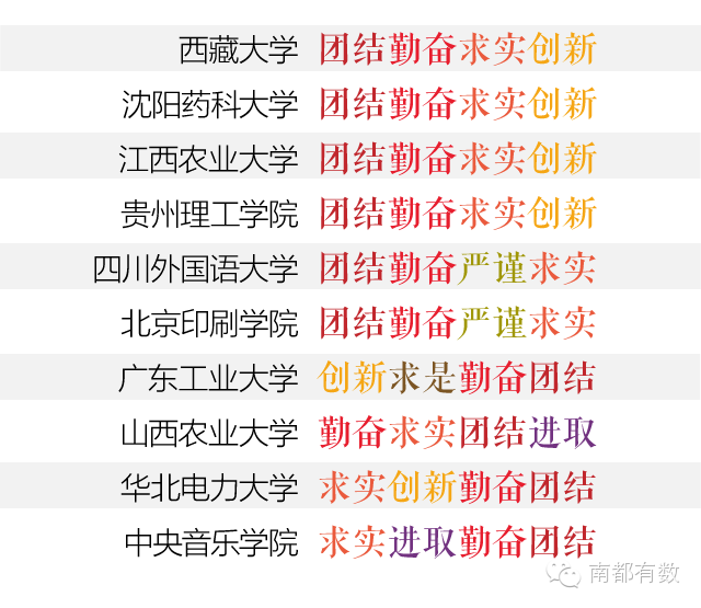 不过,有一个大体的估算是,909所大学,其校训和其他任何一个大学校训雷同度低于50%的可能只有300所左右。 下面,有数君就拿一一小部分高频撞车的出来,大家自行感受一下。