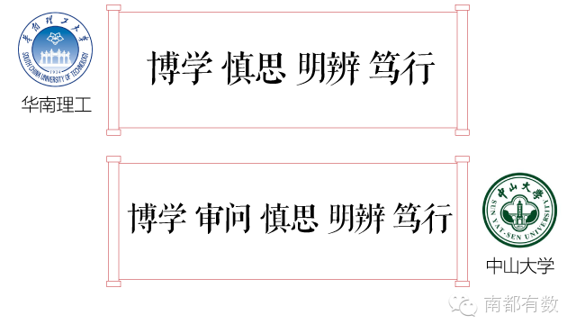 而大学和华南理工大学校训的两字之差,其中是有故事的。中大校训“博学审问慎思明辨笃行”,为孙中山先生手书,华南理工现用的校训则是2006年才更新的。不过,华南理工党委书记刘树道曾公开解释,中大曾在华工的现址办学,华工从中大校训中提炼新的校训,“既体现了历史文化传承,又有所创新”。至于为什么华工要把“审问”拿掉,刘树道当时的说法是:“要用心去体会”。(o゜▽゜)o