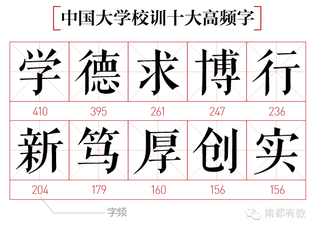 根据教育部的最新名单,全国普通本科院校共有919所,除少数没有官方校训或还在征求校训的高校外,能在官方网站或其他官方资料查明校训的高校共计909所。有数君统计发现,909所高校的校训只用到了605个汉字,其中“学”和“德”两字出现频率最高,均在400次左右。
