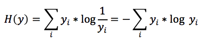 幸运的是,香农(Shannon)老先生证明了,如果你知道一个变量的真实分布,那么为了使得你使用的平均bit最少,那么你应该给这个变量的第i个取值分配log1/yi个bit,其中yi是变量的第i个取值的概率。如果我们按照这样的方式来分配bit,那么我们就可以得到最优的数据传输方案,在这个方案下,我们为了传输这个分布产生的数据,平均使用的bit数量为: